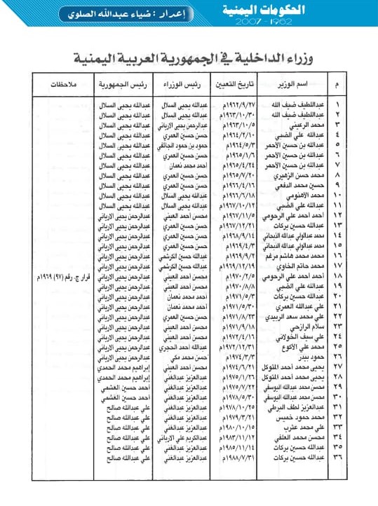 نستعرض في هذه المادة التوثيقية التاريخية أسماء وملامح سجلات وزراء الداخلية الذين تعاقبوا على المنصب في 28 حكومة تم تشكيلها خلال 28 عاما، بالاسترشاد بالمصادر المفتوحة وبما وثقّه الباحث ضياء عبدالله الصلوي في كتابه "الحكومات اليمنية 1962- 2007م".