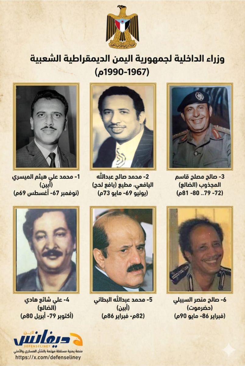 منذ إعلان الاستقلال في عدن في 30 نوفمبر 67م وقيام جمهورية اليمن الديمقراطية الشعبية، تعاقب على وزارة الداخلية 6 وزراء منذ تشكيل أول حكومة وحتى إعلان إعادة تحقيق الوحدة اليمنية بين الشطرين في 22 مايو 90م.