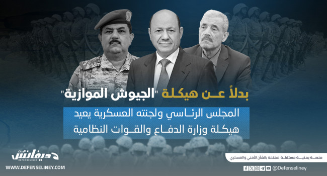 وقالت مصادر عسكرية لـ"ديفانس لاين"، إن مجلس القيادة الرئاسي، قد أقر "هيكل تنظيمي جديد للقوات المسلحة والأمن" الخاضعة لوزارتي الدفاع والداخلية، بموجب مقترح تقدمت به اللجنة الأمنية والعسكرية المشتركة المكلفة بهيكلة ودمج القوات والتشكيلات وإعادة تنظيمها ضمن هياكل الدفاع والداخلية.