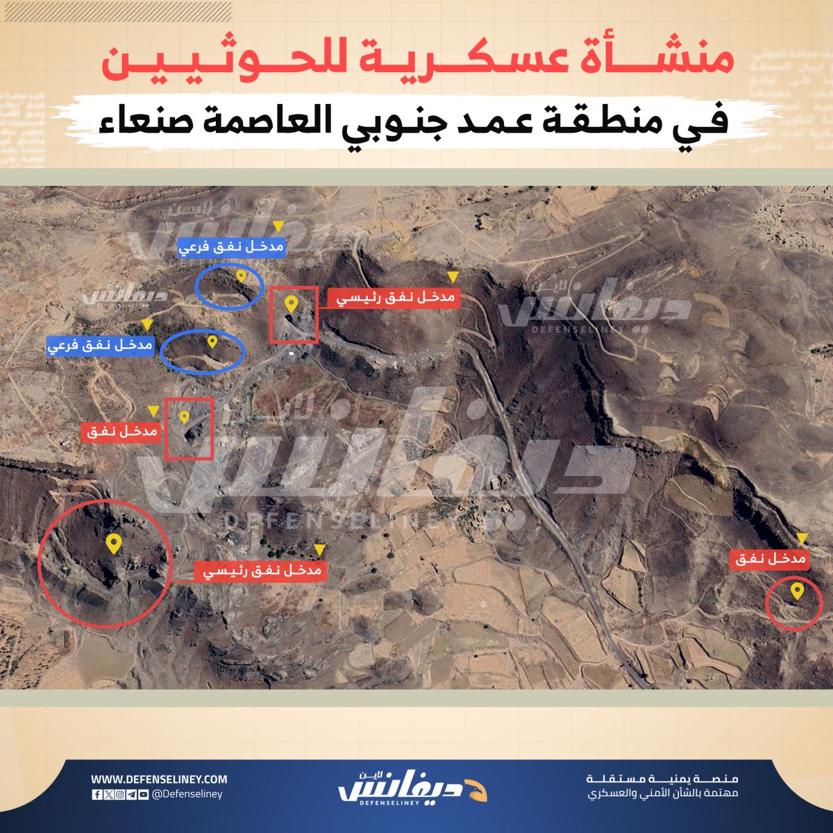 تظهر صور جوجل إرث وجود أنفاق ومخابئ تحت الأرض ومرافق عسكرية تابعة لجماعة الحوثي المدعومة من إيران في معسكر بمنطقة عمد التابعة لمديرية سنحان وبني بهلول جنوبي العاصمة صنعاء.